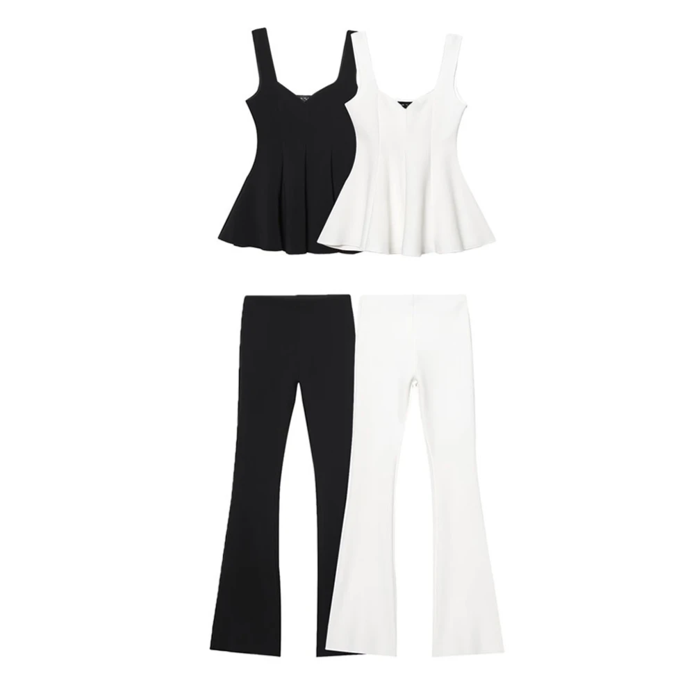 2025 New Elastic High Waist Flared Pants Sets for Women Two Pieces Simple Solid Ruched Sleeveless Top Sets Elegant 2 Piece Set